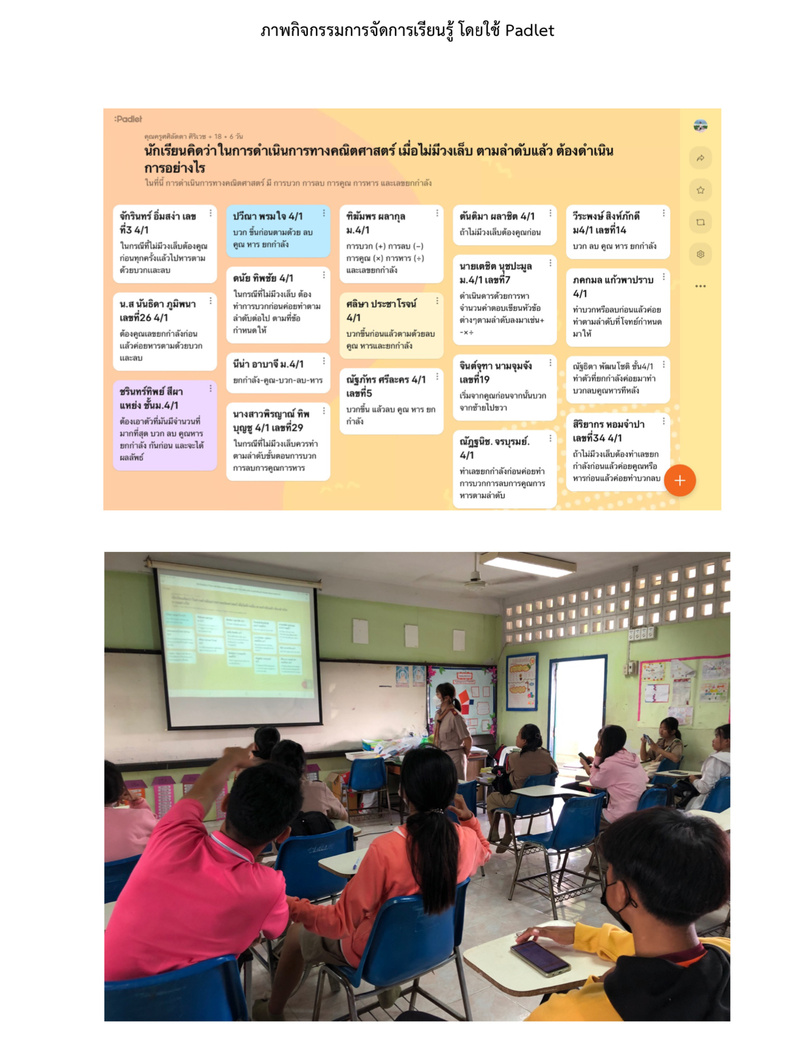 ข้าพเจ้าดำเนินการสร้างและพัฒนาสื่อการเรียนการสอนโดยใช้แอพพลิเคชัน Kahoot , WordWall , Padlet , Algebra Tiles และใช้สื่อการเรียนรู้หนังสืออิเล็กทรอนิกส์ เพื่อใช้ประกอบการอธิบายเนื้อหาในการจัดการเรียนรู้ สามารถแก้ไขปัญหาในการเรียนรู้ของผู้เรียน และทำให้ผู้เรียนมีทักษะการคิด การคำนวณ และสามารถสร้างนวัตกรรมได้