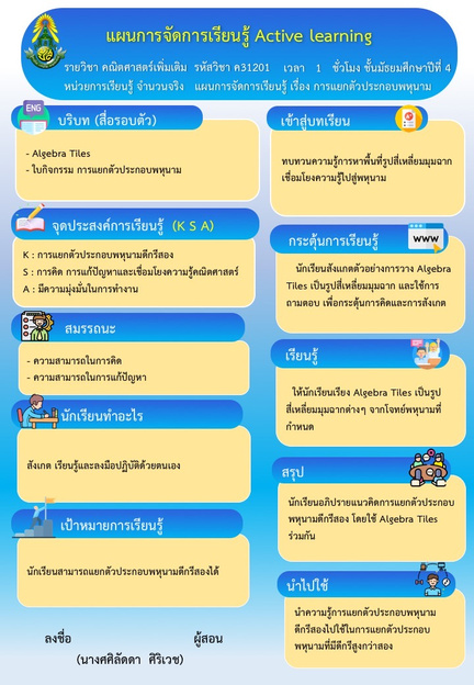ข้าพเจ้ามีการจัดกิจกรรมการเรียนรู้โดยใช้รูปแบบการจัดการเรียนรู้แบบเชิงรุก (Active Learning) ที่เน้นวิธีการปฏิบัติและมีความหลากหลาย สอดคล้องกับสาระ มาตรฐานการเรียนรู้ ตัวชี้วัด และจุดประสงค์การเรียนรู้ในแผนการจัดการเรียนรู้ มีการอำนวยความสะดวกในการเรียนรู้ และส่งเสริมผู้เรียนได้พัฒนาเต็มตามศักยภาพ เรียนรู้และทำงานร่วมกัน โดยมีการจัดกิจกรรมการเรียนรู้ที่สามารถแก้ไขปัญหาในการจัดการเรียนรู้ ทำให้ผู้เรียนมีกระบวนการคิดและค้นพบองค์ความรู้ด้วยตนเองและสร้างแรงบันดาลใจ