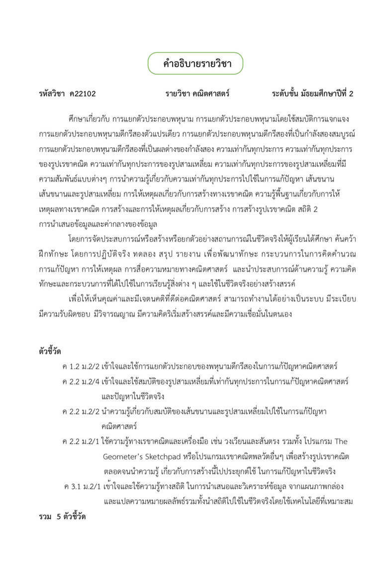 พหุนามในการแก้ปัญหาคณิตศาสตร์ 2) เข้าใจและใช้การแยกตัวประกอบของพหุนามดีกรีสองในการแก้ปัญหา คณิตศาสตร์ มีค่าเฉลี่ยที่ต่ำกว่าเกณฑ์ที่สถานศึกษากำหนด